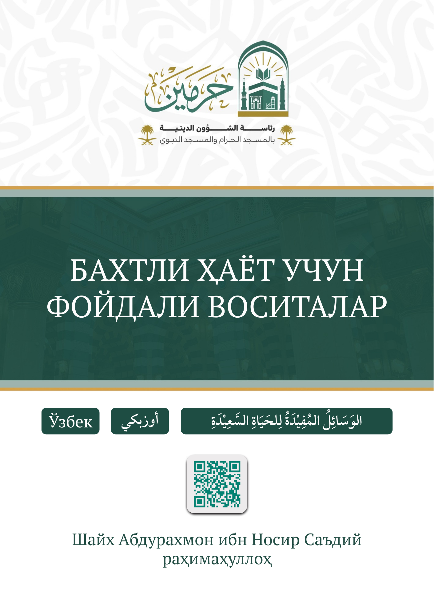 كتاب مترجم إلى اللغة الأوزبكية، يتناول الحديث عن الوسائل والأسباب التي تضفي على من اتخذها وقام بتحقيقها السرور والسعادة والطمأنينة في القلب، وتزيل عنه الهم والغم والقلق النفسي.